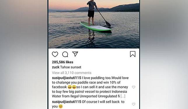 mendapat 10 persen saham Facebook. "I love paddling too. Would love to challenge you paddle race and win 10 percent of Facebook," seperti dituliskan Susi dalam komentar di postingan Instagram Mark Zuckerberg @zuck.